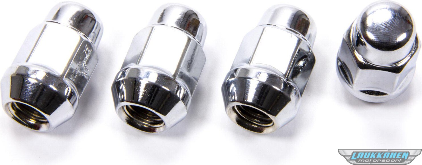 Product descriptionLug Nut - Acorn Bulge - 14 mm x 1.50 Right Hand Thread - 3/4 in Hex Head - 60 Degree Seat - Closed End - Steel - Chrome - Set of 4