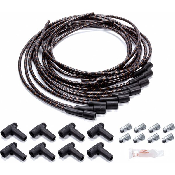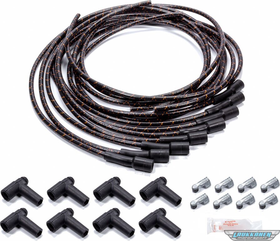 Product descriptionSpark Plug Wire Set - Spiral Core - 7.8 mm - Lacquer Covered Cotton Braid - Black / Orange - Straight Boots - HEI Style Terminal - Universal - Kit