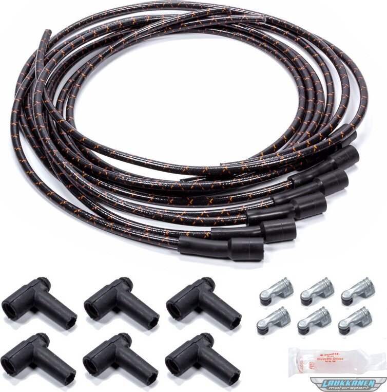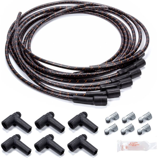 Product descriptionSpark Plug Wire Set - Spiral Core - 7.8 mm - Lacquer Covered Cotton Braid - Black / Orange - Straight Boots - HEI Style Terminal - Universal - Kit
