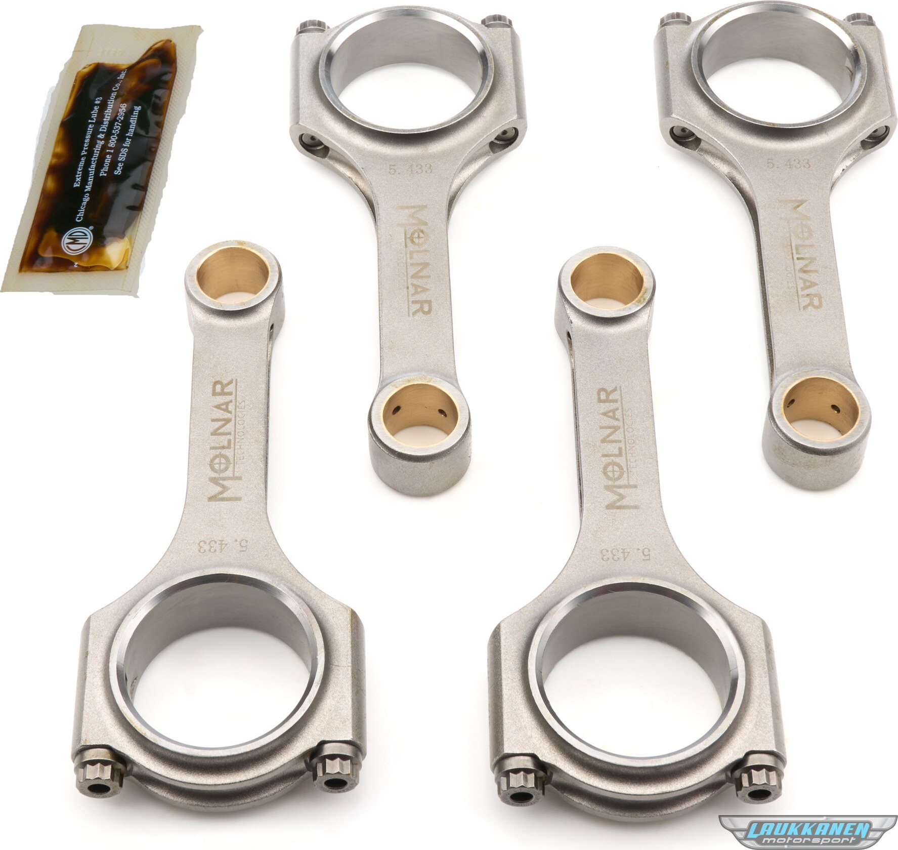 C-C length: 5.433 in. | Weight: 591 g | Bolt: 3/8 ARP2000 | Big end bore: 2.008 in. | Pin size: 22 mm