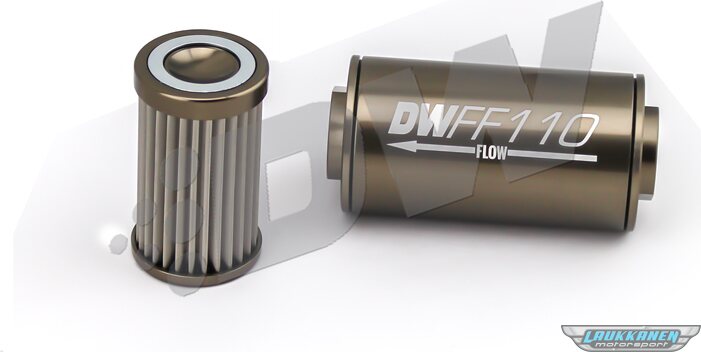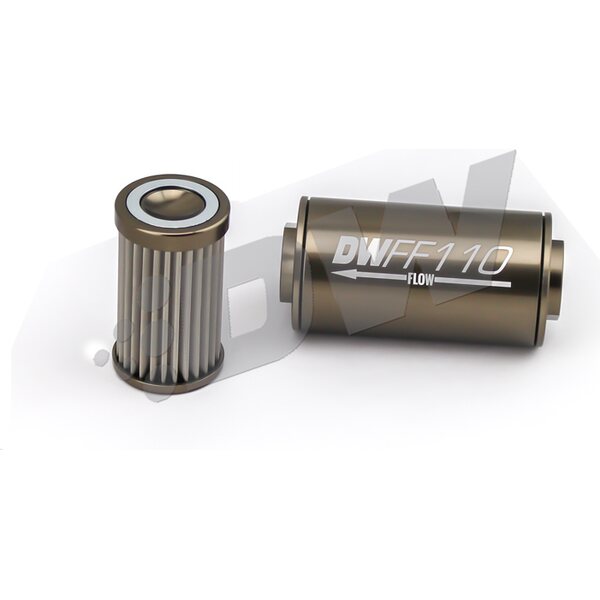DescripciónFuel Filter - In-Line - 10 Micron - Stainless Element - 10 AN Female O-Ring Inlet - 10 AN Female O-Ring Outlet - 110 mm Long - Aluminum - Titanium Anodized - Each