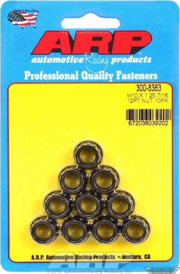 DescripciónNut - 10 mm x 1.25 Thread - 12 mm 12 Point Head - Small Collar - Chromoly - Black Oxide - Universal - Set of 10