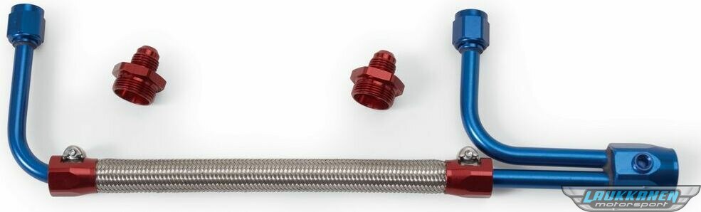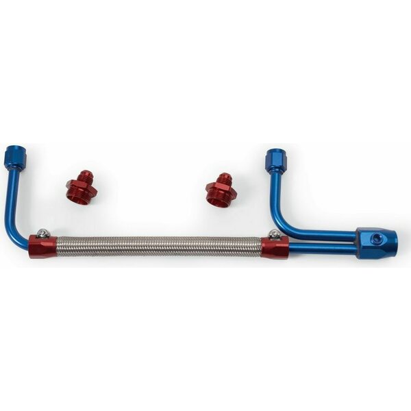Description du produitCarburetor Fuel Line - 3/8 in NPT Female Inlet - 7/8-20 in Dual Outlets - Stainless Hose - Blue / Silver - Adjustable - Holley Carbs - Kit