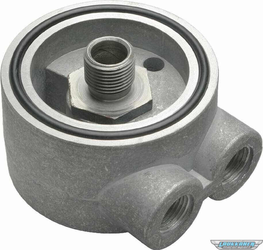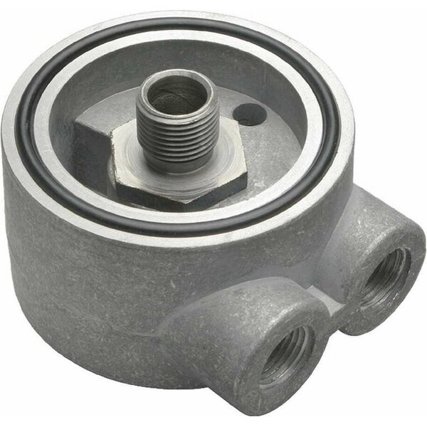 Oil Cooler Adapter - Sandwich - 18 mm x 1.50 Center Thread - 3/8 in NPT Female Inlet - 3/8 in NPT Female Outlet - Aluminum - Natural - Small Block Chevy - Each