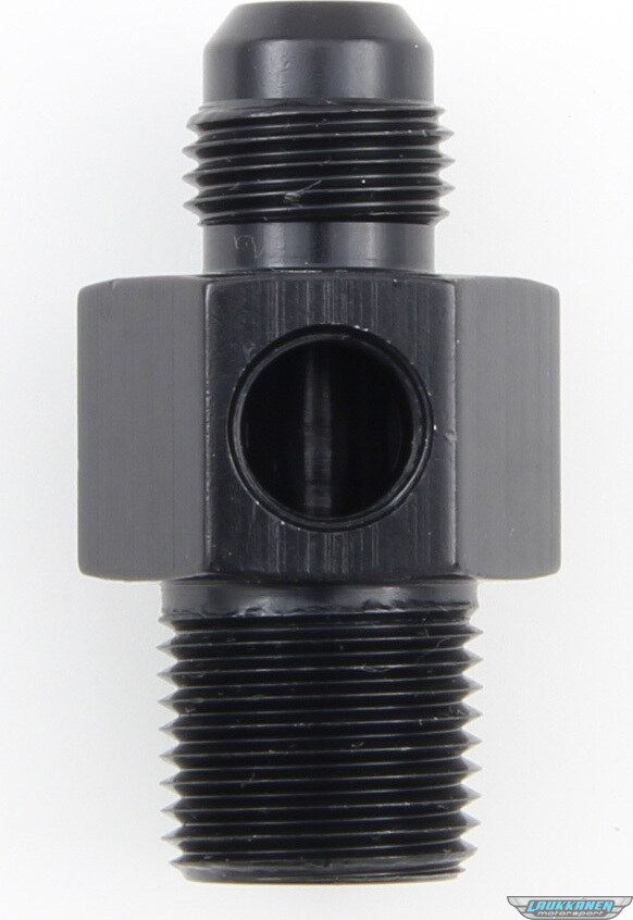 Fitting - Gauge Adapter - Straight - 6 AN Male to 3/8 in NPT Male - 1/8 in NPT Gauge Port - Aluminum - Black Anodized - Each