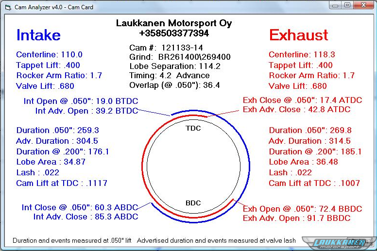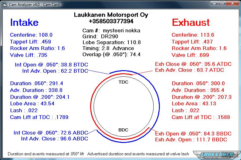 Program to record and analyze cam lift data from dial indicator and degree wheel measurements. Once this data is in the computer, you can check the Cam Profile for acceleration rates, lobe centers, Duration at .050", etc. Now you can see if the cam you just installed matches the cam grinder's specs.