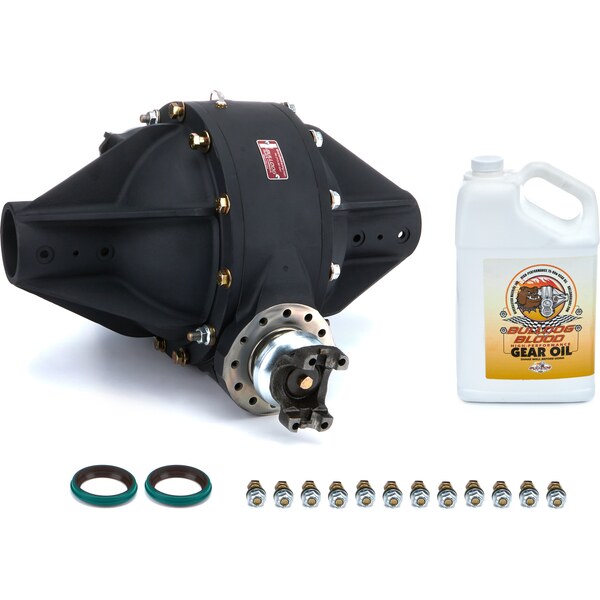 Saturday Night Special - 60 centered 100% magnesium center section and bells O-ringed rear cover Inspection plug and fill level plug Breather assembly Aluminum spool Correct length center hardware Bell to tube hardware -10an Fitting for fill can Precision ground heat treated lower shaft Black Thermal coating Bulldog blood gear oil Low drag seals