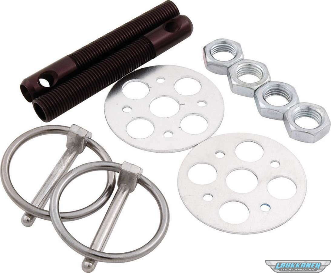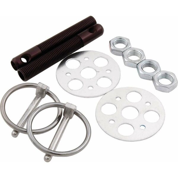 Hood Pin - Lightweight - 3/8 in OD x 2-3/4 in Long - 1-5/8 in OD Scuff Plates - Torsion Clips - Hardware Included - Gun Drilled - Aluminum - Black Anodized - Kit