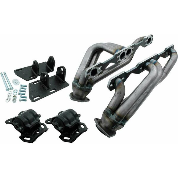 Additional information THIS KIT DOES NOT ALLOW A V8 ENGINE TO SIMPLY BOLT IN. IN ALMOST EVERY ENGINE SWAP SOME MODIFICATIONS NEED TO TAKE PLACE, THIS MAY INCLUDE THE ABILITY TO WELD, CUT OR MODIFY EXISTING COMPONENTS.THIS KIT MAY BE USED ON 2.5 LITER 4 CYLINDER, 2.8 LITER AND 4.3 LITER EQUIPPED VEHICLES WHEN FRAME MOUNTS ARE CHANGED TO THE ALL38115, WHICH ARE STOCK REPLACEMENT FRAME MOUNTS FOR 2.8 LITER V-6. AND INCLUDED IN THIS KIT.Kit includes the following components: TRA9926 Motor Mounts ALL38115 Motor Mount HED69520 Headers