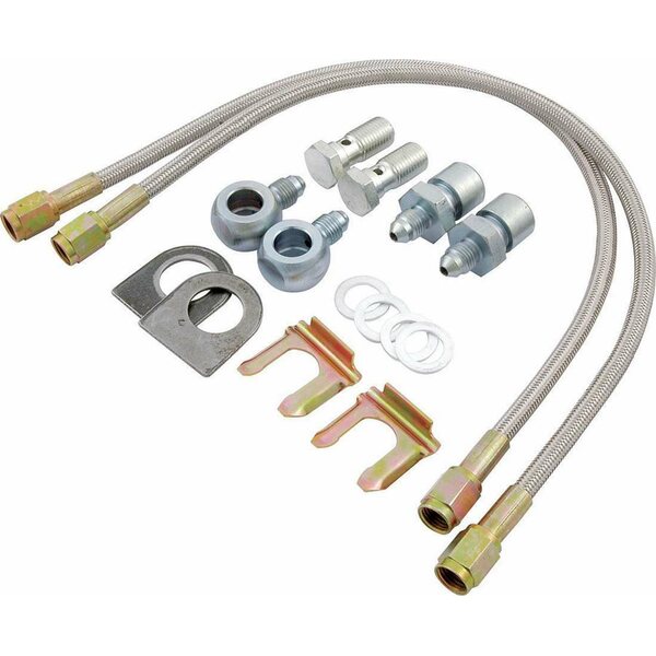 Brake Hose Kit - 15 in Long - 3 AN Straight Inlet - 3 AN Straight Outlet - Fittings / Tabs - Braided Stainless - GM Metric Calipers - Kit
