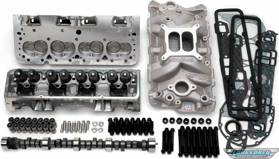 Edelbrock part #2022 E-Street Top End Kit is designed for 1957-86 Small-Block Chevy V-8 engines. This Top End Kit produced 315 HP & 381 TQ on a 350 c.i.d Chevy with 9.0:1 compression. The kit delivers affordable street performance and great drivability from idle to 5,500 rpm.