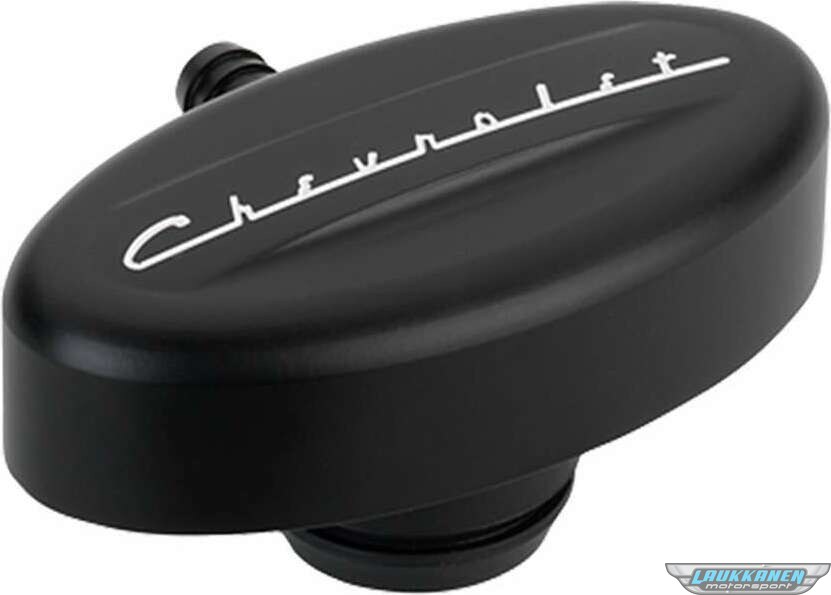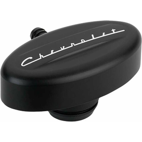 Breather - Push-In - Oval - 1-1/4 in Hole - PCV - 3/8 in Hose Evacuation Fitting - Chevrolet Logo - Billet Aluminum - Black Anodized - Each