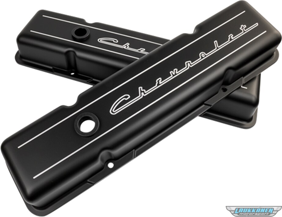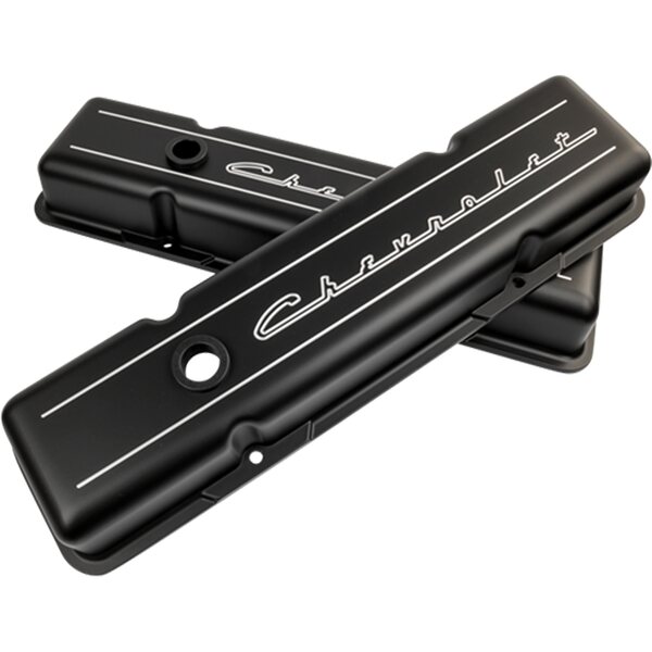 Valve Cover - Stock Height - Baffled - Breather Hole - Grommets - Chevrolet Logo - Billet Aluminum - Black Paint - Small Block Chevy - Pair