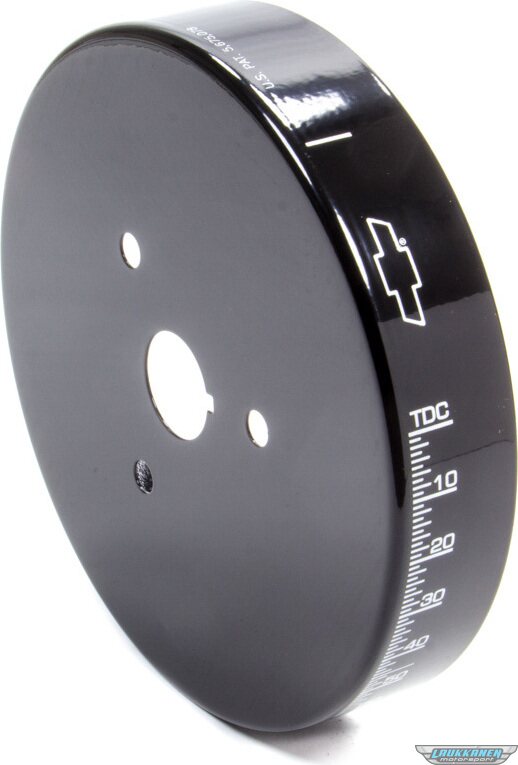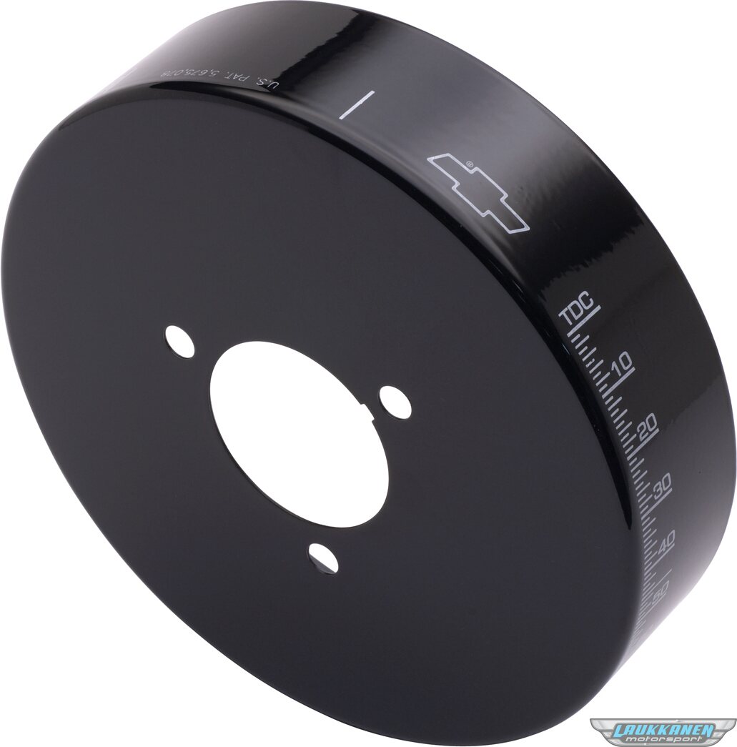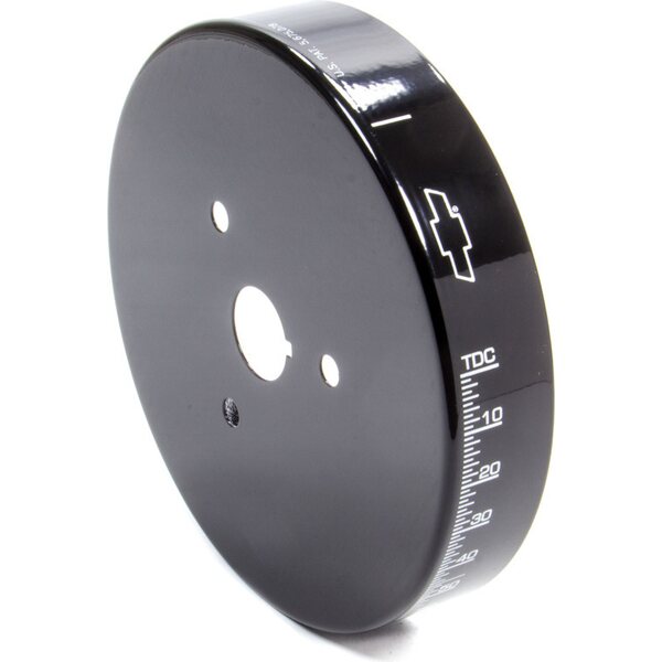 These patented harmonic balancer covers offer improved readability, more stable Top Dead Center indication and timing accuracy, enhanced appearance for a previously ignored underhood area, and the elimination of timing tapes which are inevitably flung off. They are available in chrome and black, resulting in parts with the appearance of 200.00 balancers. Each cover is distinctively marked with the famous Bowtie Emblem, Top Dead Center and the proper timing degrees. Using this cover improves timing accuracy because over time the etched outer inertia ring of a typical harmonic balancer may slip in relation to the center hub of the balancer, causing the etched markings to provide an inaccurate indication of Top Dead Center for the number 1 piston. Mounted directly through the center hub, this cover eliminates the affect of any outer inertia ring slippage. Aluminum. U.S. Patent 5,675,078. Sold as each.