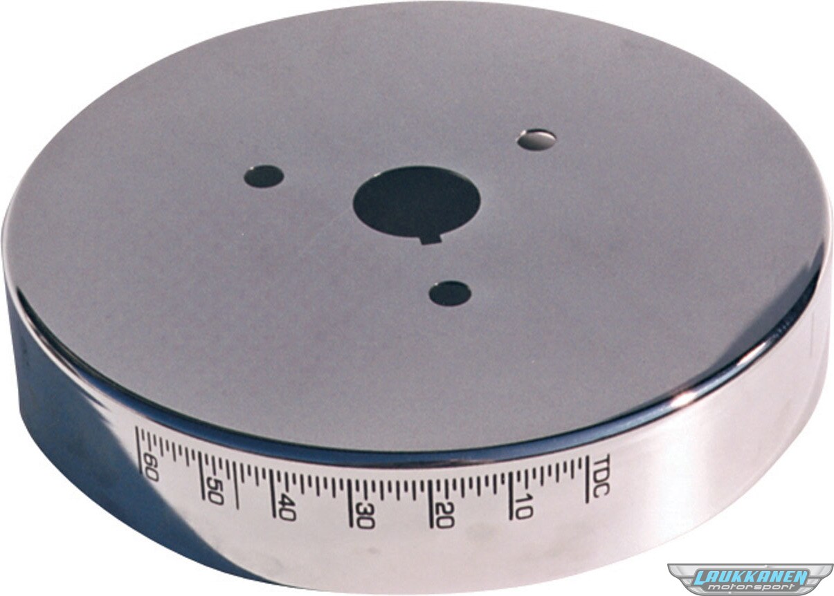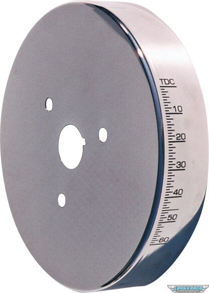 Proform patented harmonic balancer covers offer improved readability, more stable Top Dead Center indication and timing accuracy, enhanced appearance for a previously ignored underhood area, and the elimination of timing tapes which are inevitably flung off. They are available in chrome and black, resulting in parts with the appearance of 200.00 balancers. Each cover is distinctively marked with the famous Bowtie Emblem, Top Dead Center and the proper timing degrees. Using this cover improves timing accuracy because over time the etched outer inertia ring of a typical harmonic balancer may slip in relation to the center hub of the balancer, causing the etched markings to provide an inaccurate indication of Top Dead Center for the number 1 piston. Mounted directly through the center hub, this cover eliminates the affect of any outer inertia ring slippage. Aluminum. U.S. Patent 5,675,078. Sold as each.