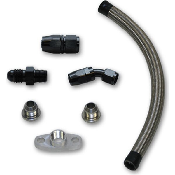 Turbocharger Oil Drain - Bolt-On 1/2 in NPT Female Flange - 20 in Braided Stainless Hose / Bungs / Fittings Included - Aluminum Flange - GT Series Turbo - Kit
