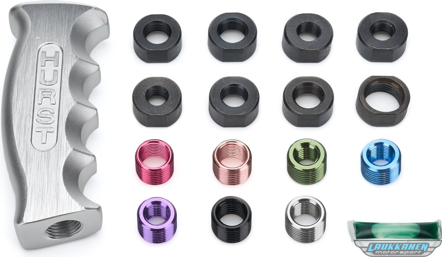 Shifter Knob - Pistol Grip - 3/8-16 in, 7/16-20 in, 1/2-20 in, 10 mm x 1.25, 10 mm x 1.5, 12 mm x 1.25, 12 mm x 1.75, 16 mm x 1.5 Thread - Hurst Logo - Aluminum - Clear Anodized - Universal - Each