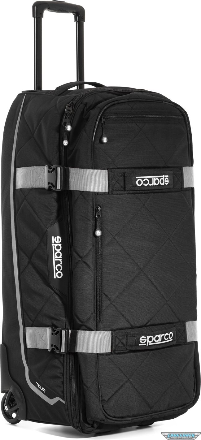 Gear Bag - Tour - 33 in Long x 15 in Wide x 16 in Deep - Roller Wheels - Zipper Closure - Retractable Handle - Sparco Logo - Silver Straps - Black - Each