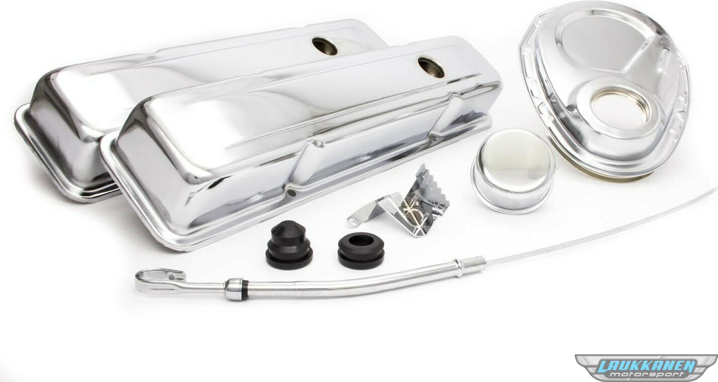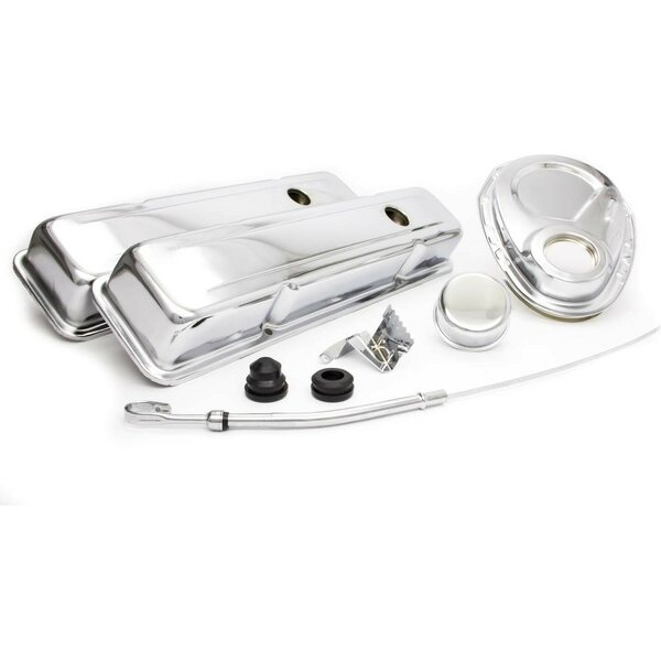 Engine Dress Up Kit - Short Valve Covers / Breather / Dipstick / Grommets / Timing Cover / Timing Tab - Steel - Chrome - Small Block Chevy - Kit