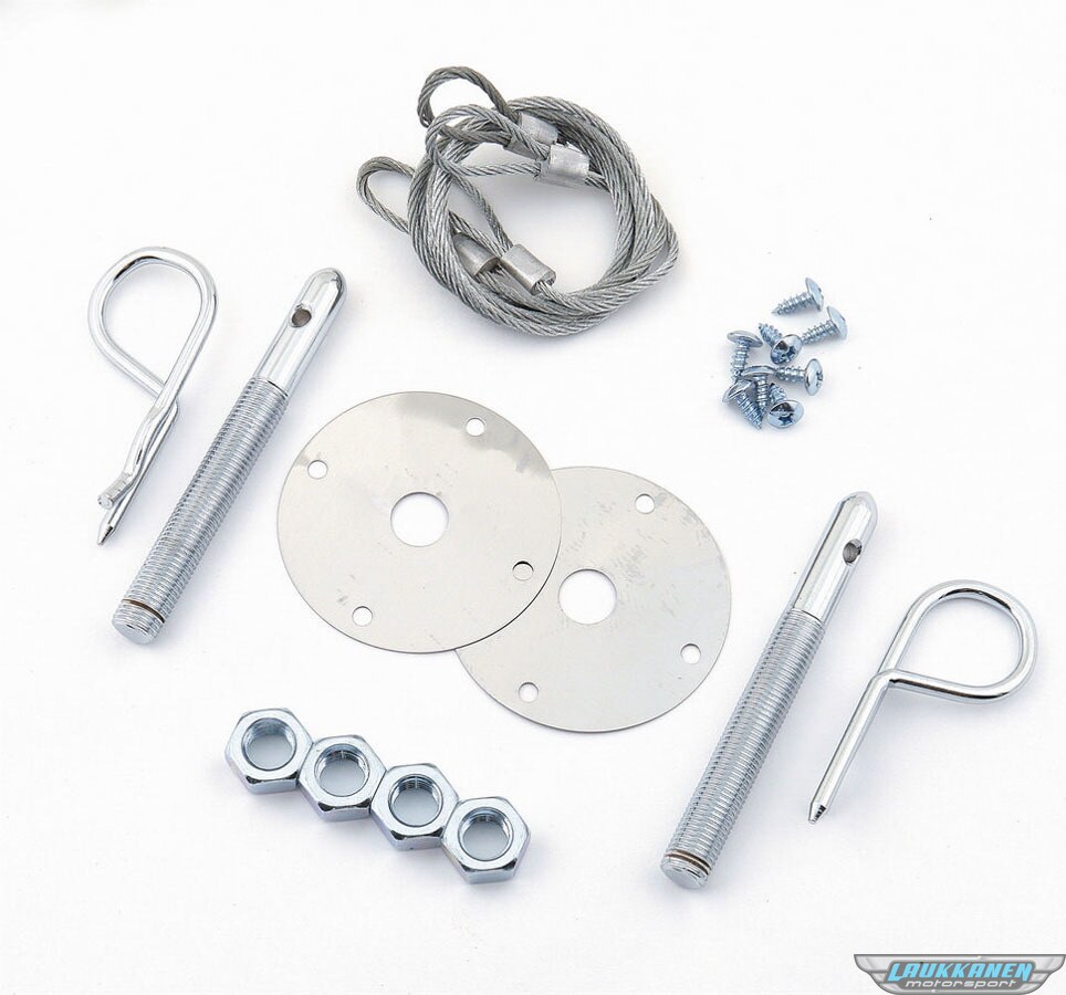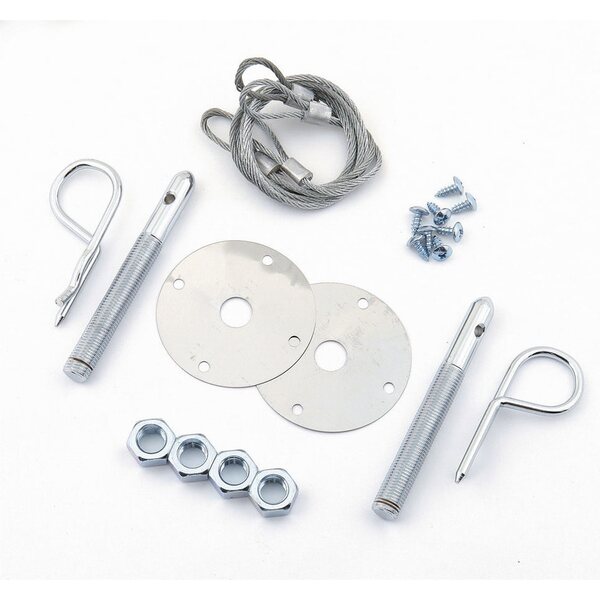 Hood Pin - Hood or Deck Pin Kit - Competition - 7/16 in OD x 4 in Long - 2-1/2 in OD Scuff Plates - Hairpin Clips - Lanyards - Hardware Included - Steel - Chrome - Kit