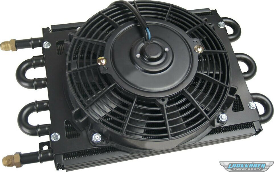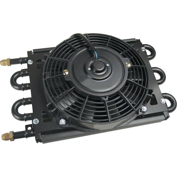 Fluid Cooler and Fan - Dyno-Cool - 13.625 x 7.625 x 3.625 in - Tube Type - 6 AN Male Inlet / Outlet - Aluminum / Copper - Black Powder Coat - Kit