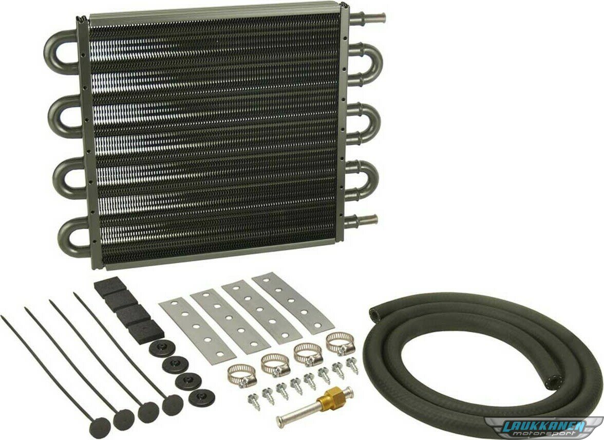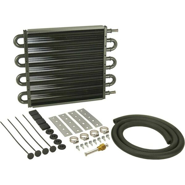 Fluid Cooler - 12.750 x 10.250 x 0.750 in - Tube Type - 11/32 in Hose Barb Inlet / Outlet - Fitting / Hardware / Hose - Aluminum / Copper - Black Powder Coat - Automatic Transmission - Kit