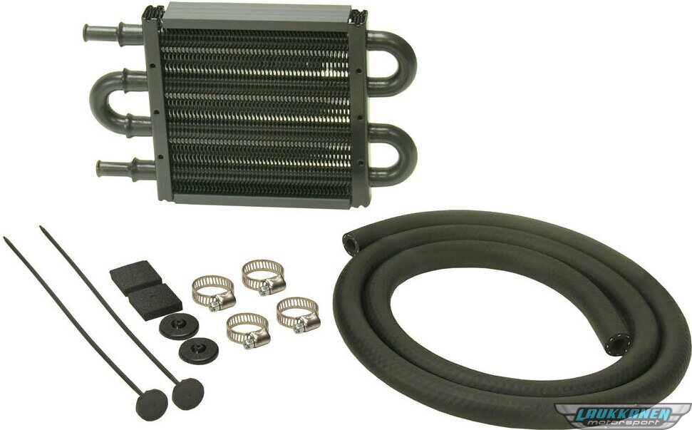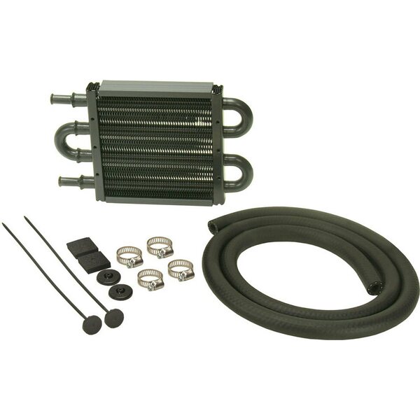 Fluid Cooler - 8.125 x 5 x 0.750 in - Tube Type - 11/32 in Hose Barb Inlet / Outlet - Hardware / Hose - Aluminum / Copper - Black Powder Coat - Power Steering - Kit