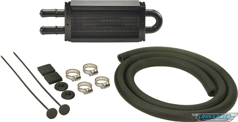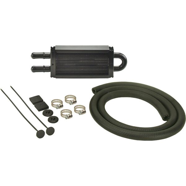 Fluid Cooler - 8.125 x 2.500 x 0.750 in - Tube Type - 11/32 in Hose Barb Inlet / Outlet - Hardware / Hose - Aluminum / Copper - Black Powder Coat - Power Steering - Kit