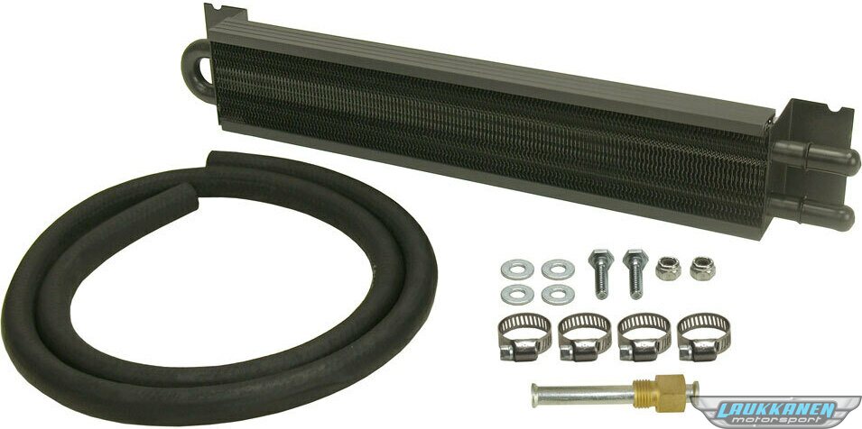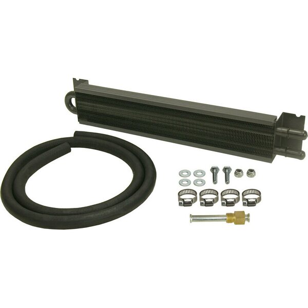 Fluid Cooler - 16.750 x 1.750 x 2.625 in - Tube Type - 11/32 in Hose Barb Inlet / Outlet - Fitting / Hardware / Hose - Aluminum / Copper - Black Powder Coat - Automatic Transmission - Kit