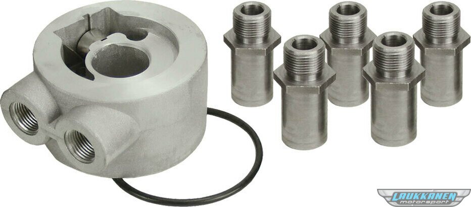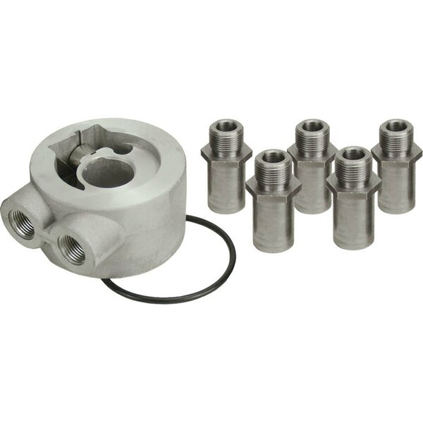 Oil Cooler Adapter - Thermostatic - Sandwich - Various Center Thread Adapters - 3/8 in NPT Female Inlet - 3/8 in NPT Female Outlet - Aluminum - Engine Oil Cooler - Kit