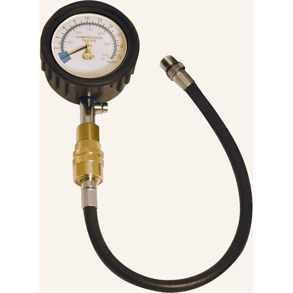 Compression Gauge - 0-300 psi - Mechanical - Analog - 2-1/2 in Diameter - White Face - Black Pointer - 14 mm Plug Adapter - Each