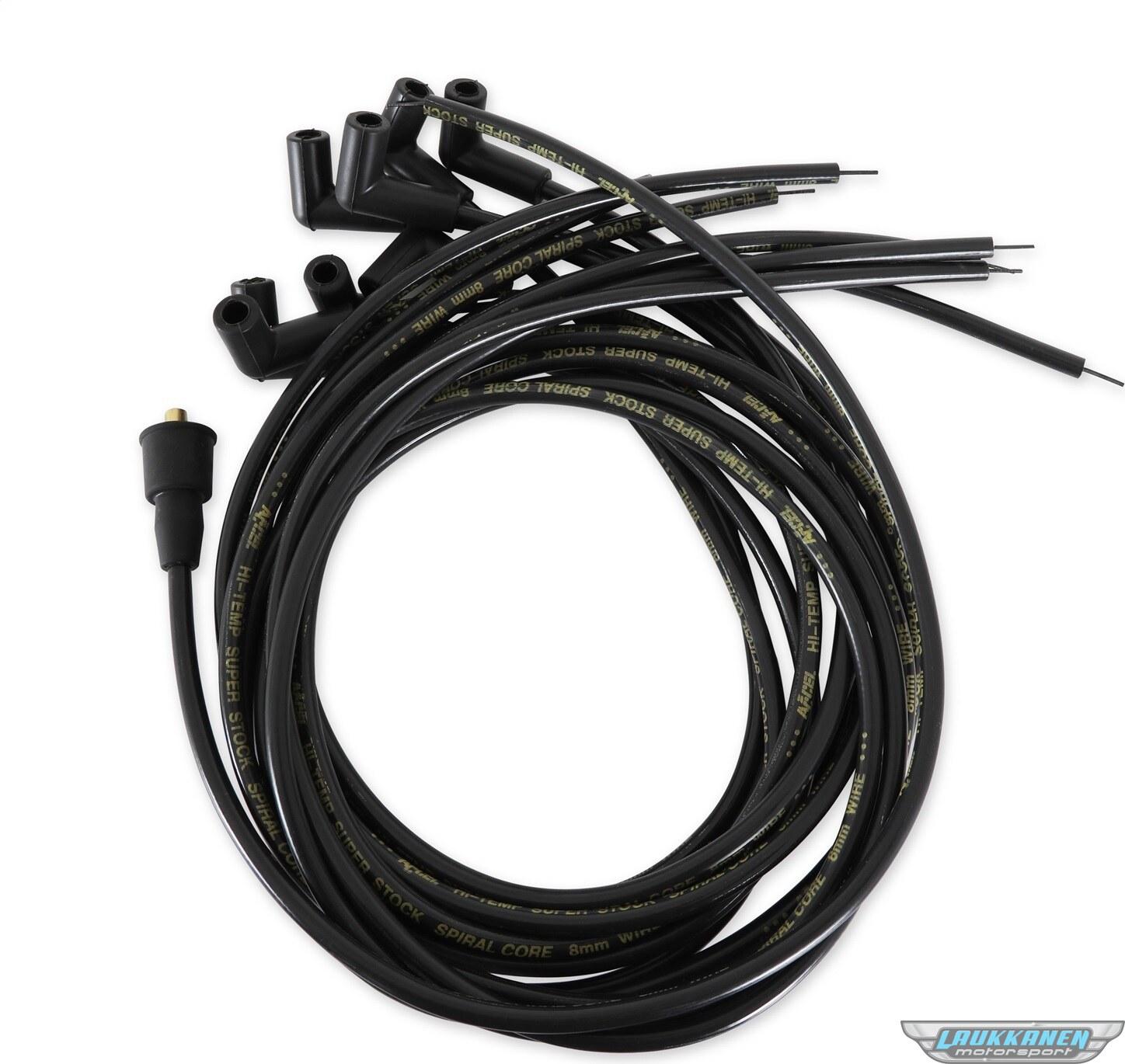 Tuotteen kuvausSpark Plug Wire Set - Super Stock - Spiral Core - 8 mm - Black - 90 Degree Plug Boots - HEI Style Terminal - Cut-To-Fit - V8 - Kit