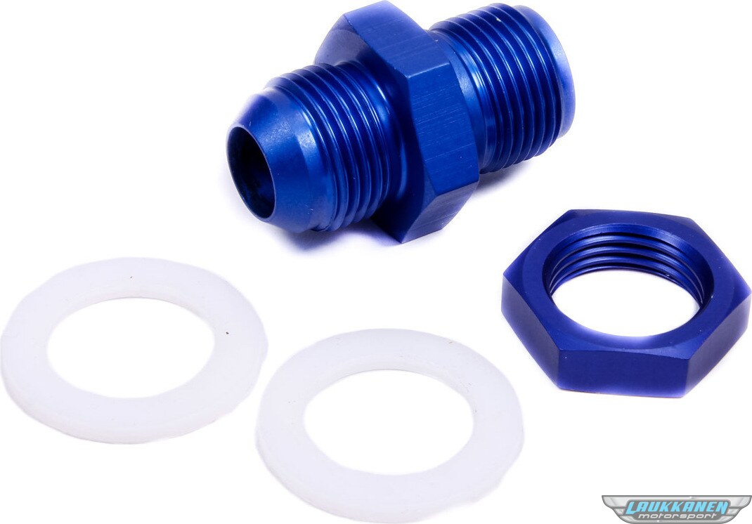 Fitting - Bulkhead - Straight - 12 AN Male to 12 AN Male Bulkhead - PTFE Gaskets Included - Aluminum - Blue Anodized - JAZ Fast Flow Fuel Cells - Each