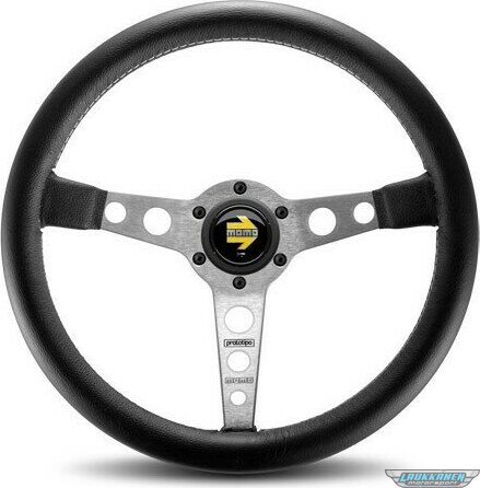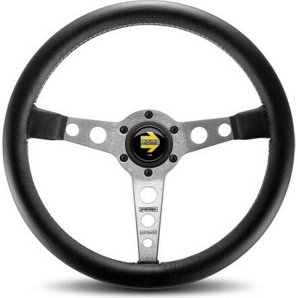Tuotteen kuvausSteering Wheel - Prototipo - 350 mm Diameter - 3 Spoke - 39 mm Dish - Black Leather Grip - Aluminum - Brushed - Each