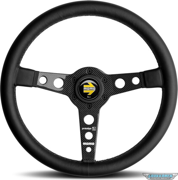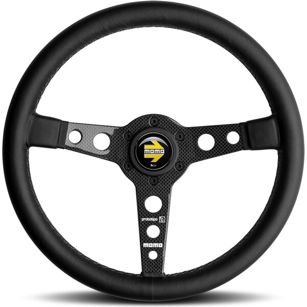 Tuotteen kuvausSteering Wheel - Prototipo 6C - 350 mm Diameter - 3 Spoke - 39 mm Dish - Black Leather Grip - Carbon Fiber - Natural - Each