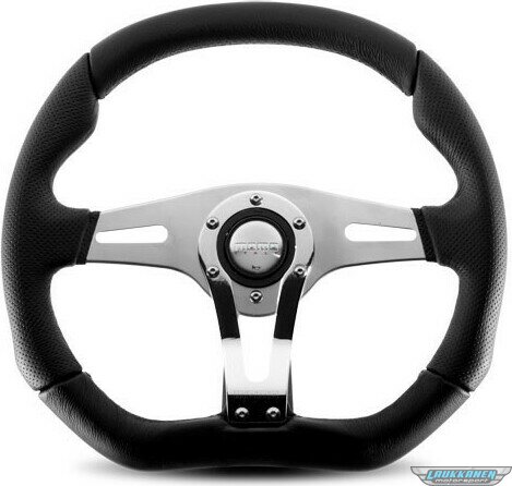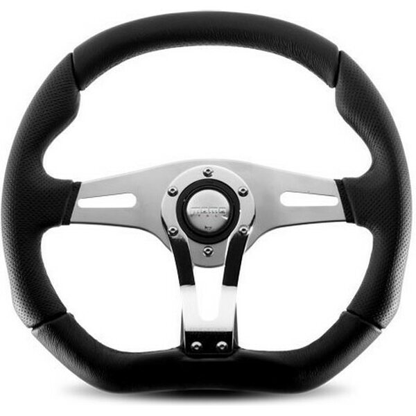 Tuotteen kuvausSteering Wheel - Trek R - 350 mm Diameter - D-Shaped - 3 Spoke - 40 mm Dish - Black Leather Grip - Aluminum - Brushed / Chrome - Each