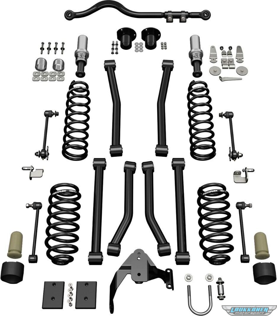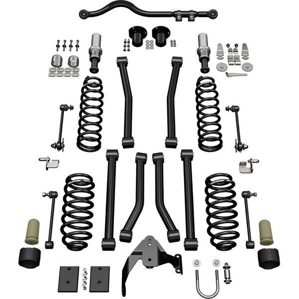 Tuotteen kuvausSuspension Lift Kit - 3 in Lift - Springs / Sway Bar Links / Track Bar / Bump Stops / Trailing Arms / Brackets / Hardware Included - Polyurethane - Black - Jeep Wrangler JK 2007-25 - Kit