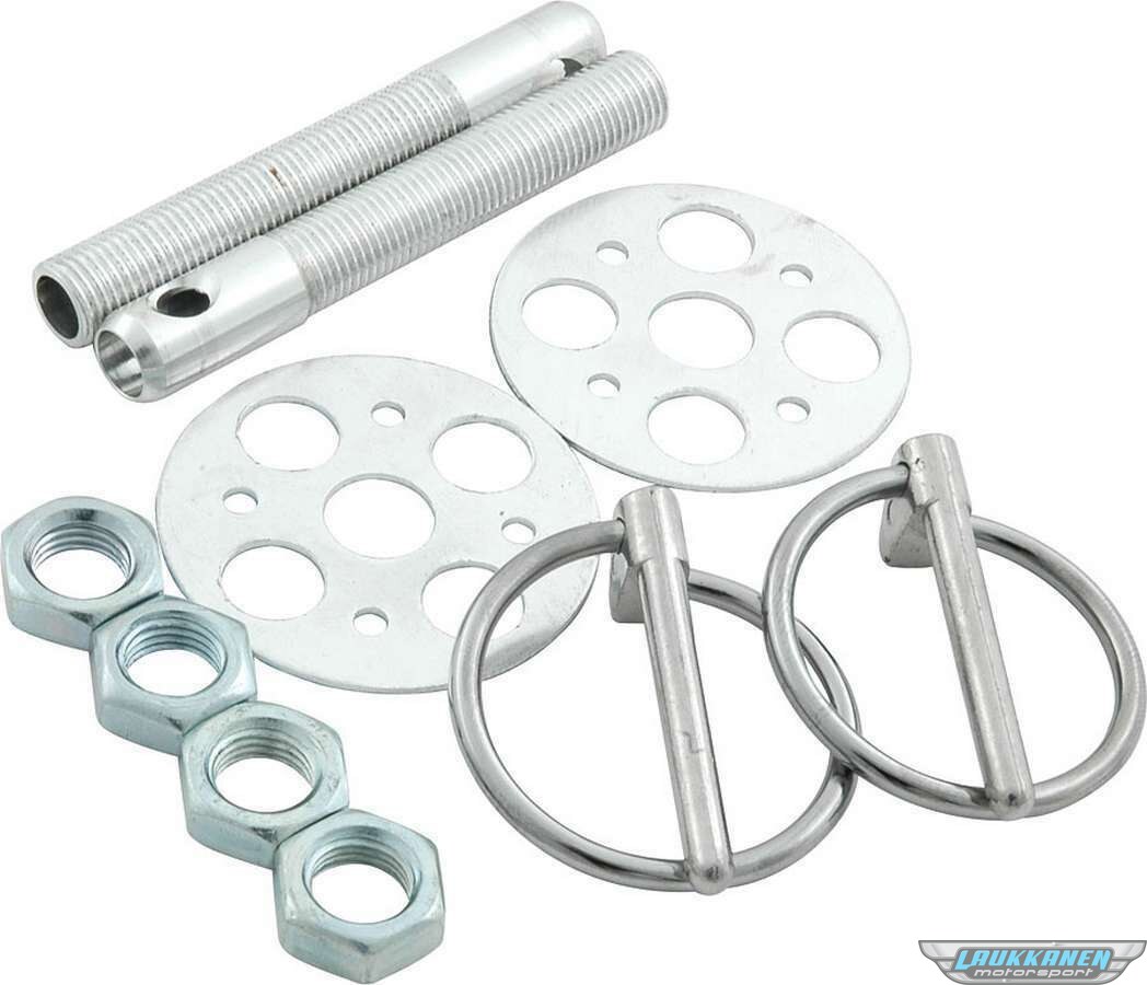 Hood Pin - Lightweight - 3/8 in OD x 2-3/4 in Long - 1-5/8 in OD Scuff Plates - Torsion Clips - Hardware Included - Gun Drilled - Aluminum - Clear Anodized - Kit