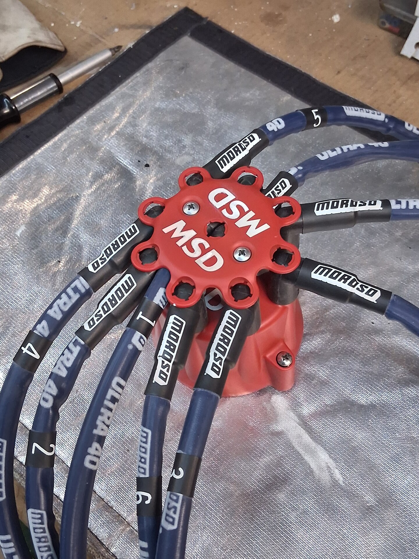 Tuotteen kuvausSpark Plug Wire Set - Ultra 40 - Spiral Core - 8.65 mm - Sleeved - Blue - 135 Degree Plug Boots - HEI Style Terminal - Big Block Ford - Kit