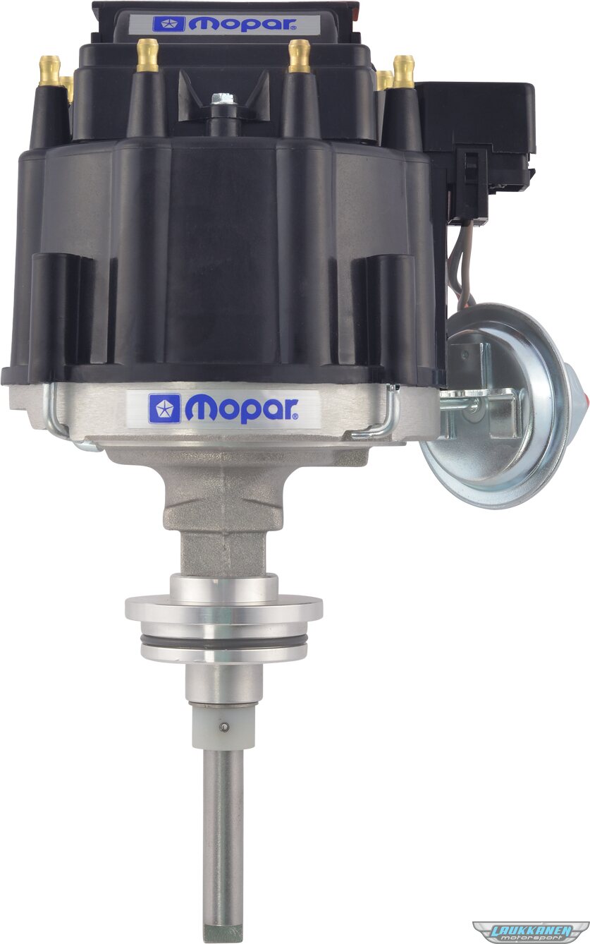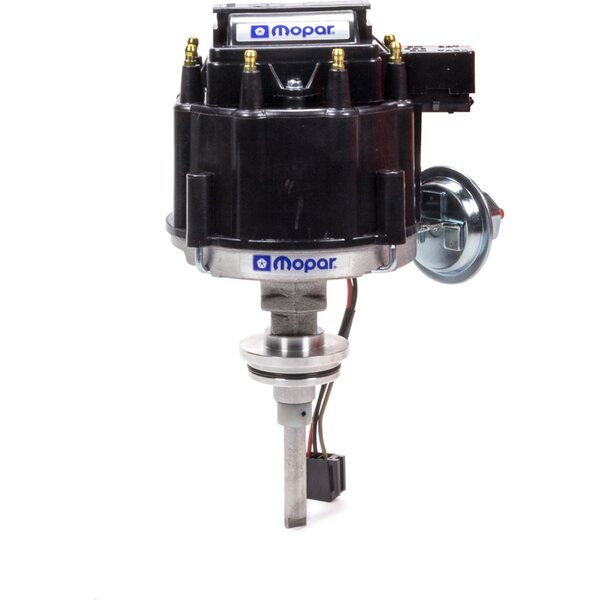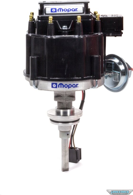 This 100 percent new high-performance distributor produces a 50,000 volt spark through 7,500 RPM. Easy 1-wire hookup, low-saturation ignition module, premium cap with brass terminals, and high-power coil! Each high performance, factory set distributor, has a retro-style Mopar Emblem prominently displayed beneath the black cap. Fits Chrysler 273-318-340-360 Small Block Engines.