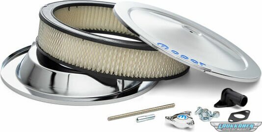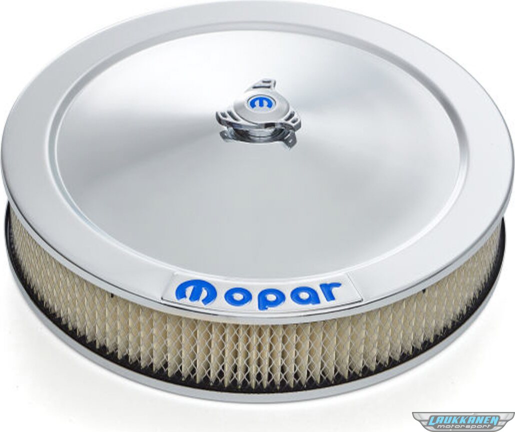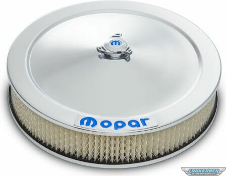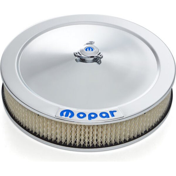 Time to replace your current air cleaner with a high quality MOPAR emblem air cleaner. This air cleaner uses the signature MOPAR blue emblem as seen in other like dress-up engine parts. Overall height 3.375 inch. The kit includes: 14 inch chrome lid, quality AC Delco filter, chrome drop base tray, high tech center nut with MOPAR emblem, mounting hardware, and optional PCV hookup.