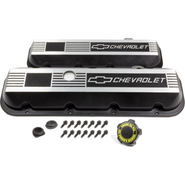 Valve Cover - Custom - Stock Height - Breather Hole - Hardware Included - Grommets - Chevrolet Logo - Aluminum - Black / Brushed - Big Block Chevy - Pair