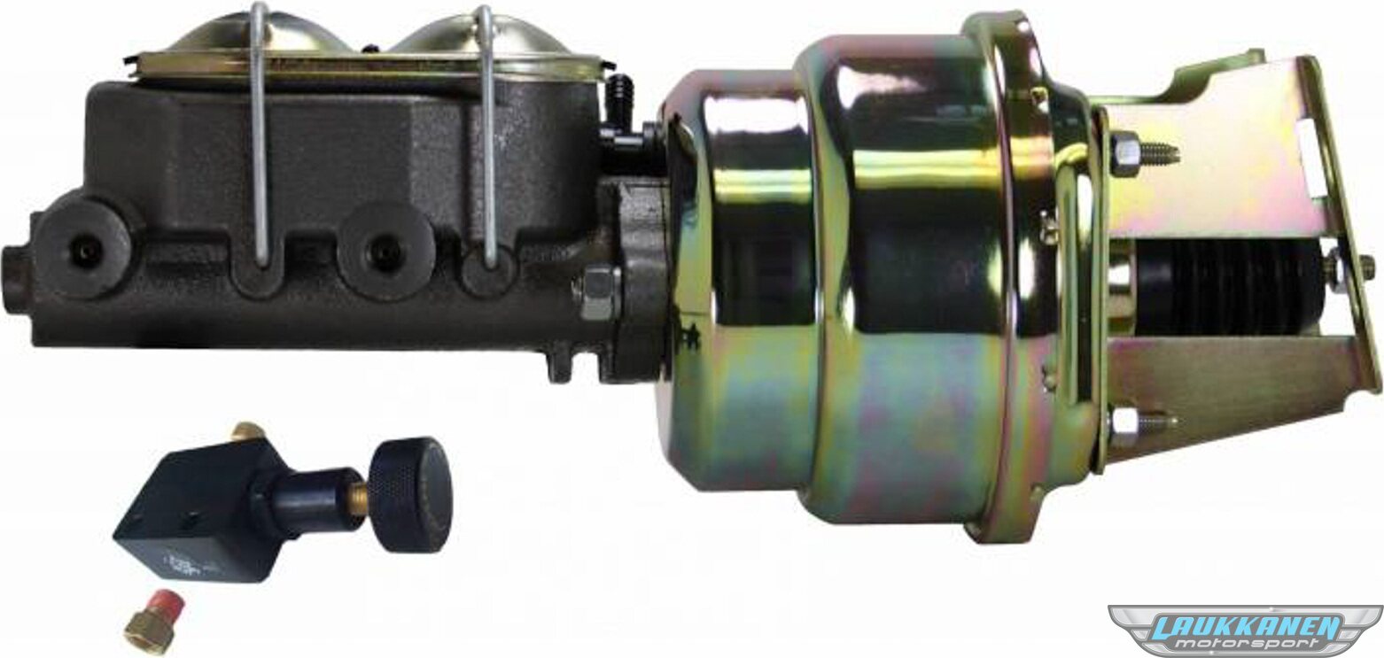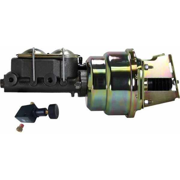 Master Cylinder and Booster - 1-1/8 in Bore - Dual Integral Reservoir - 7 in OD - Single Diaphragm - Proportioning Valve - Steel - Gold Zinc Plated - GM A-Body 1955-68 - Kit